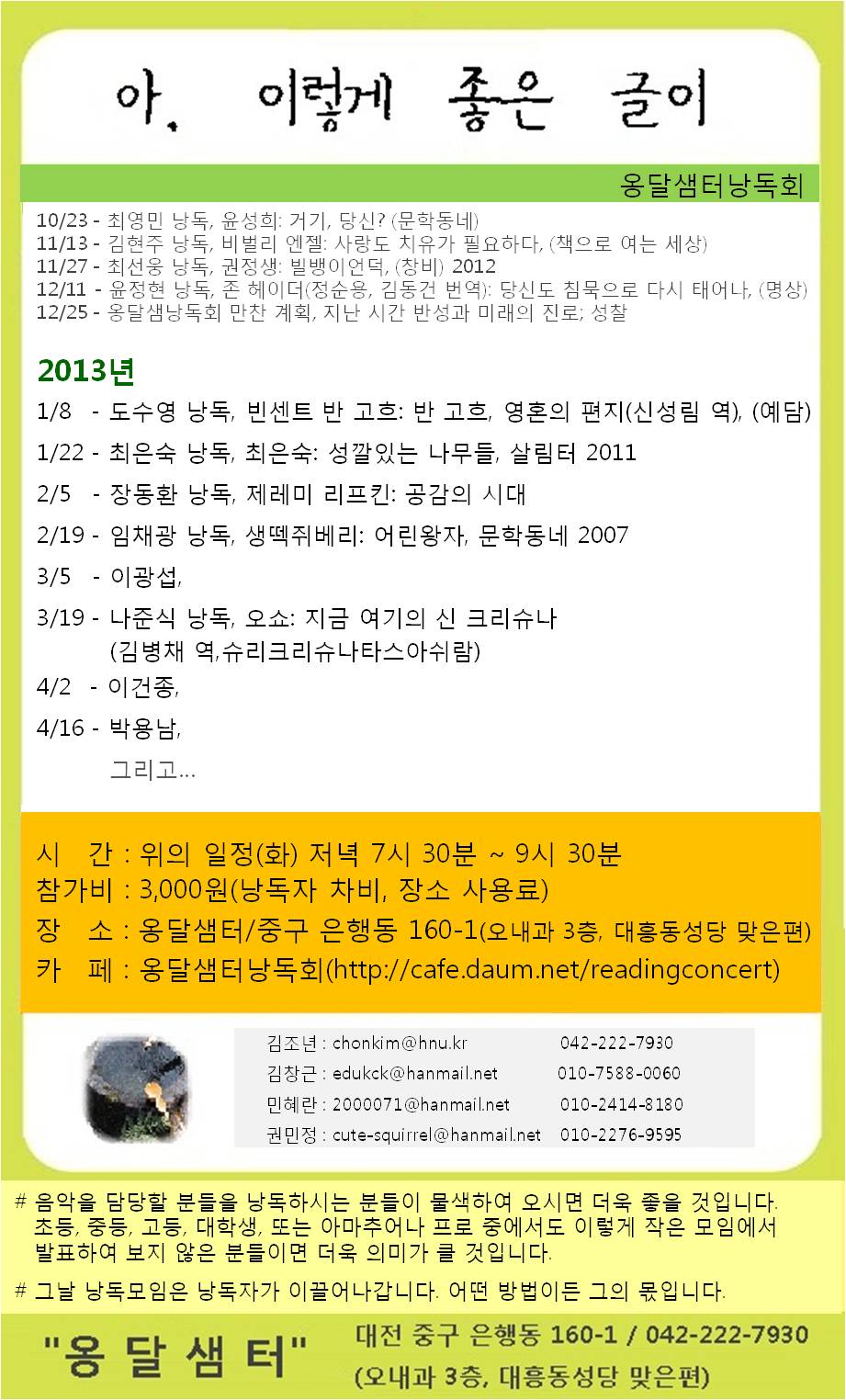 제목 옹달샘터 낭독회, 3월19일에 나준식원장님이 낭독자 ^^*